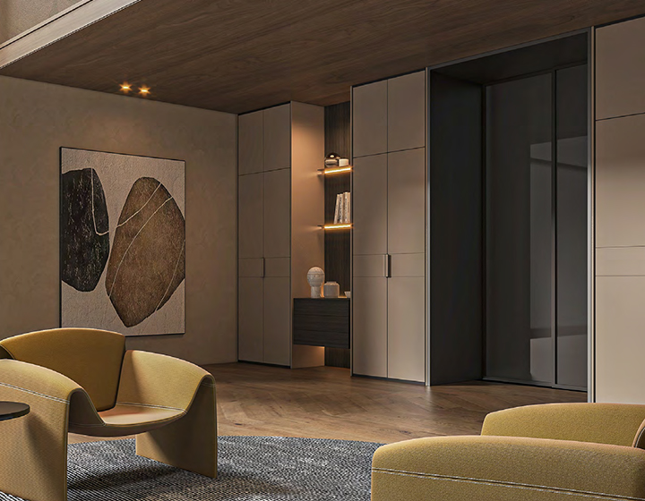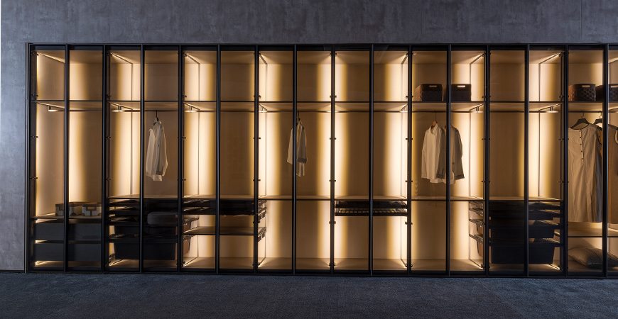 柜內線燈位于立柱槽口向內照射,不刺眼,且光線不會被懸掛的衣物等收納物品遮擋,方便物品的取用。